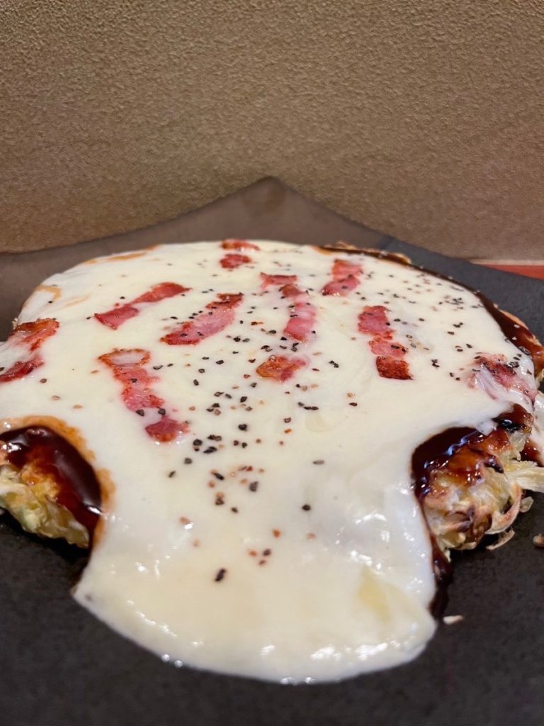 ブラックペッパーとベーコンが味を引き締めてくれて、ここまでチーズを使っているのに、お好み焼きとチーズの相性がサイコーに合うんです🌈