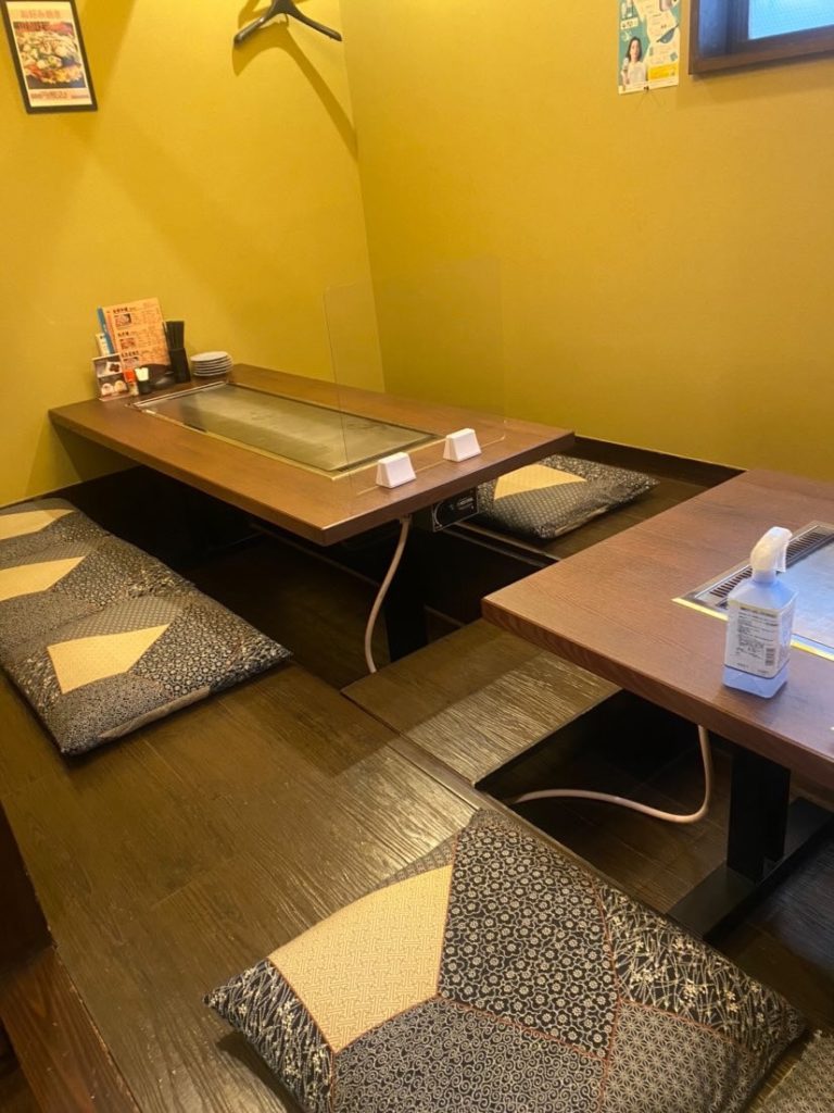 店内は掘りごたつ式の席に鉄板があるので、家族や友人と一緒にワイワイ焼けちゃう♪