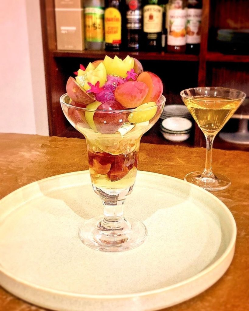 パフェ自体は種無しで皮ごと食べられるものをふんだんに使用しており、中にはしっかりと味の濃いぶどうアイスとディル風味にチーズ、サクサクした焼菓子、紅茶のジュレなどで食後にも良さそうなくどくないパフェでした😌