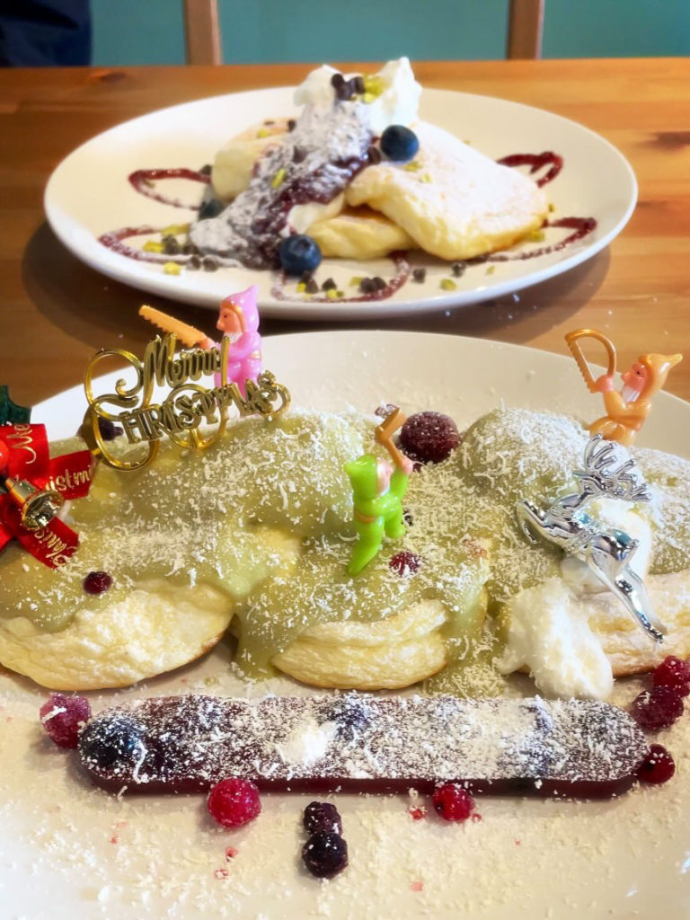 期間限定のクリスマスメニューのパンケーキは、ホワイトチョコを降り注いでくれて素敵✨