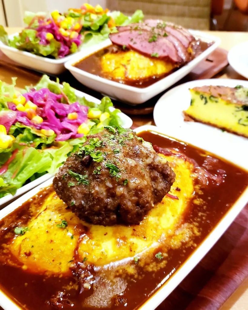 ❇️牛タン100%ハンバーグのせビーフシチューオムライス