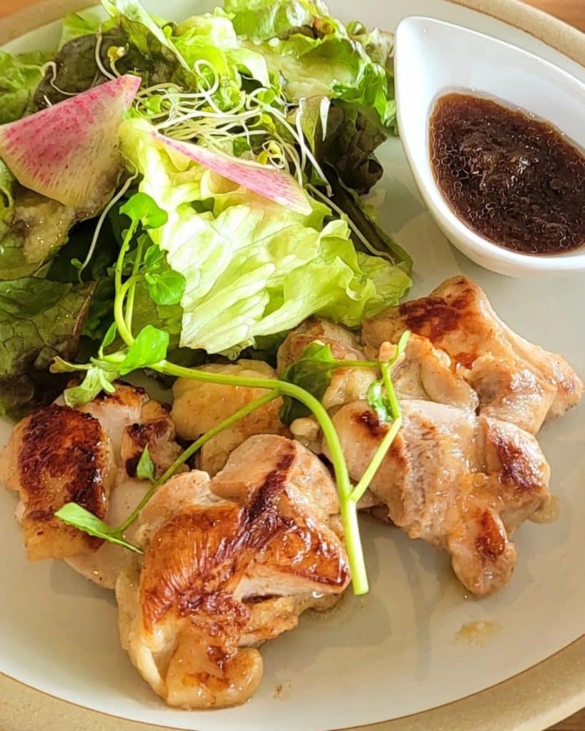 プレートに乗るサラダには珍しい甘酢ドレッシング
