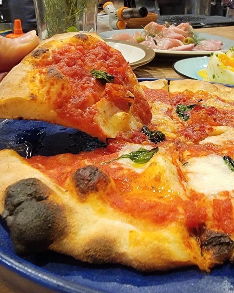 高温のピザ窯で焼き上げるから