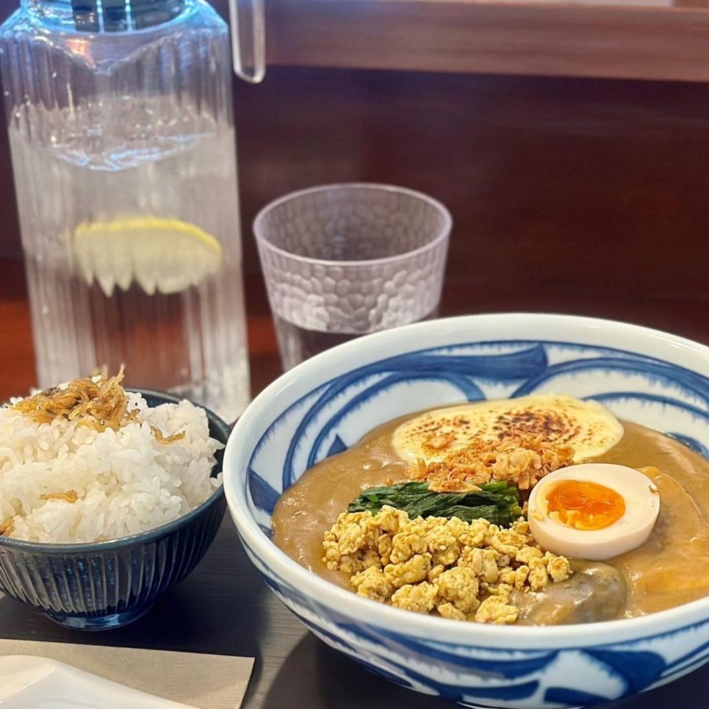 味玉、ミンチ、ほうれん草、油揚げが入ったカレーうどん😍