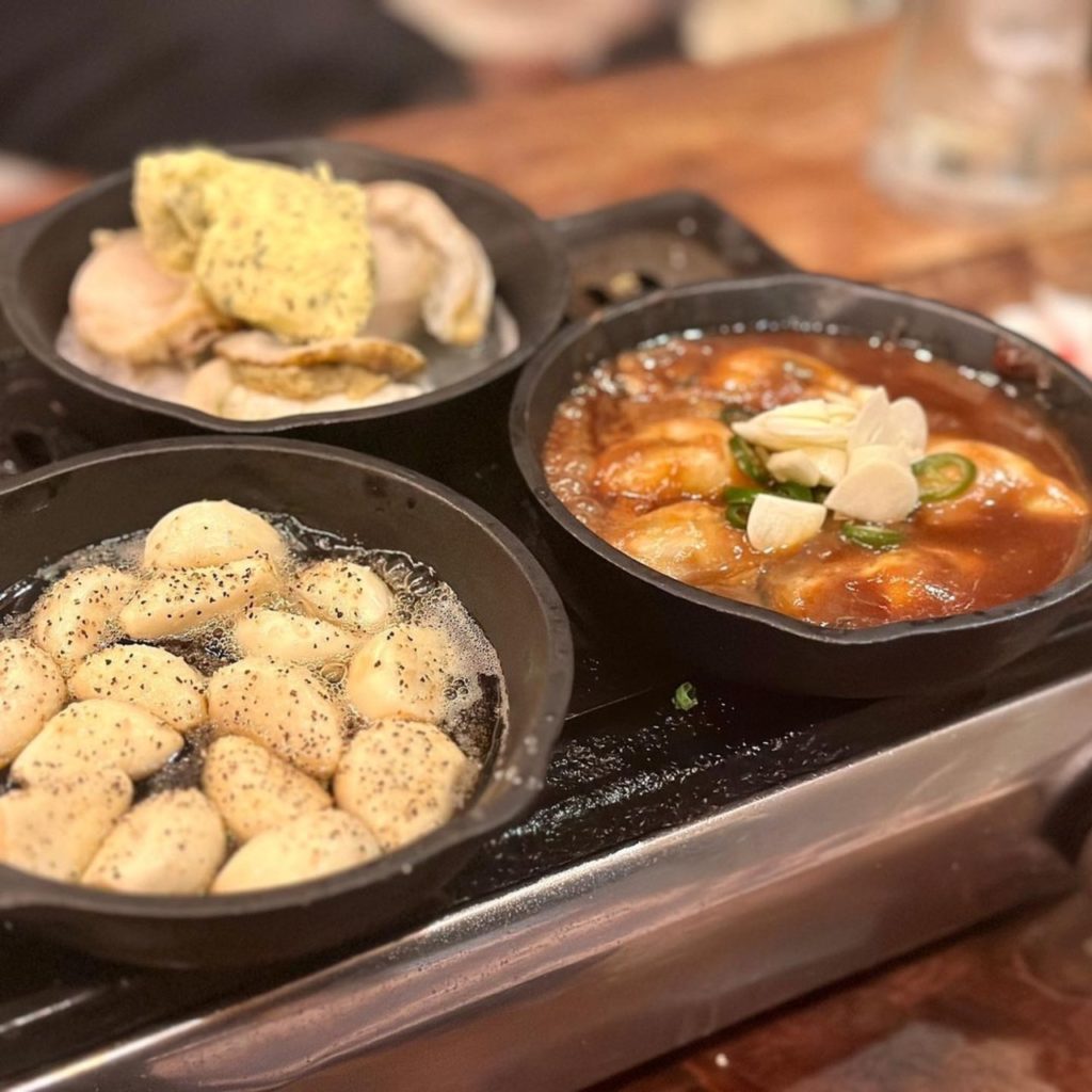 スキレットで提供される、ホタテバター、ニンニクオイル、青唐焼き牡蠣味噌🧄🦪