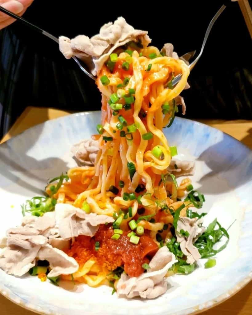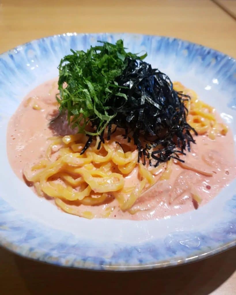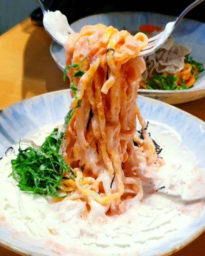 7月からの限定メニューで、“罪なたらすぱ”の冷製バージョンに豚しゃぶと梅が加わった、夏にぴったりなさっぱりとした味わい🎐
