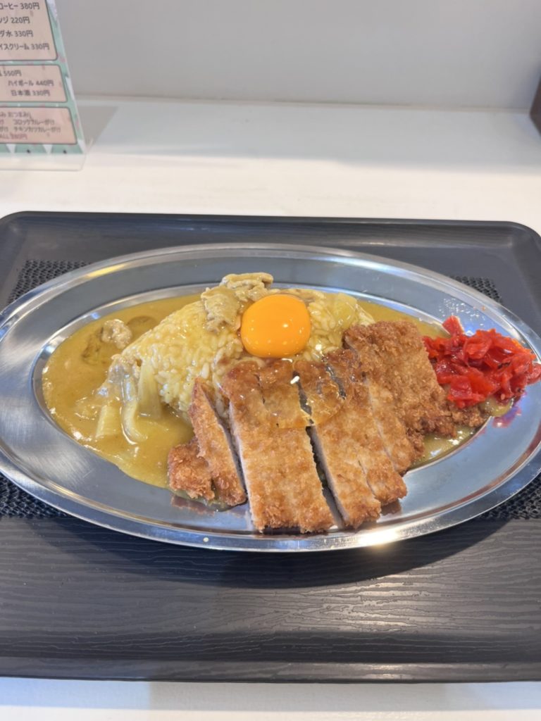 カレーのてっぺんに生卵をセットして、福神漬けをセットしたら完了