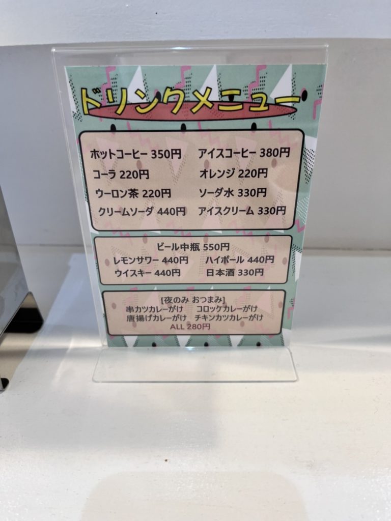 定番のソフトドリンクに、アルコール類もあって、ディナータイムにはちょっとしたおつまみメニューもあります