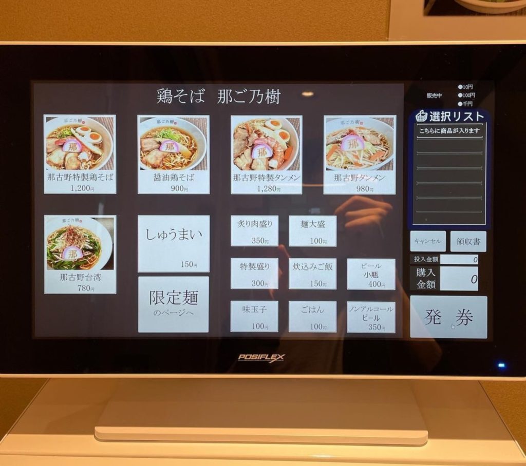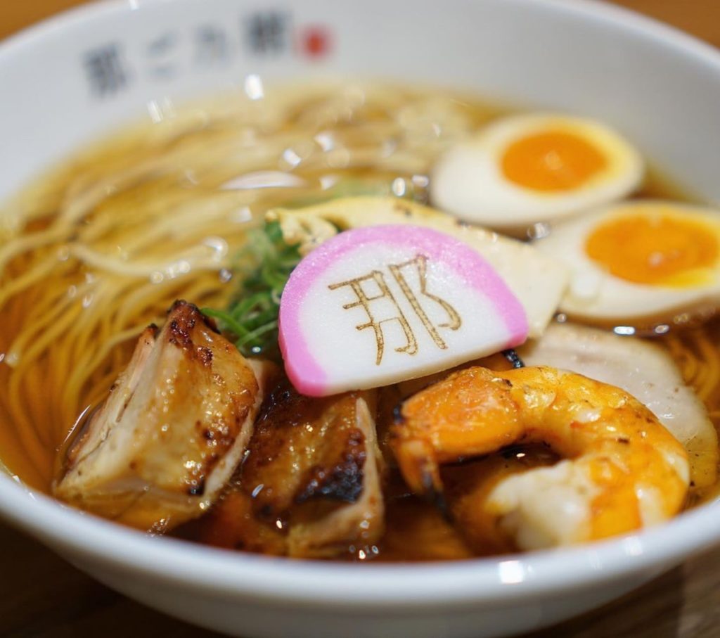 醤油ベースの鶏そばに、炭火で炙られたエビやチャーシュー、筍、味玉、「那」の刻印が刻み込まれたかまぼこがのった豪華な逸品🍜