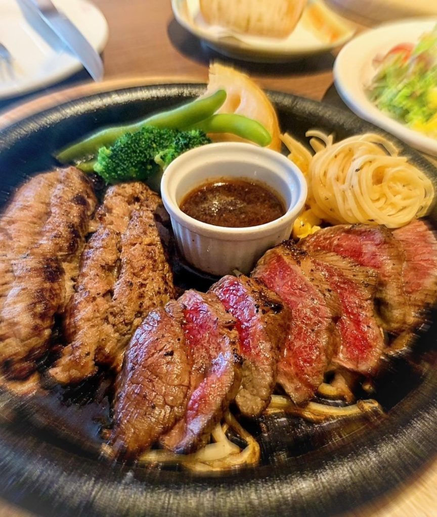 ・レア加減に焼かれ、鉄板の上でカットされてから運ばれてきます♪